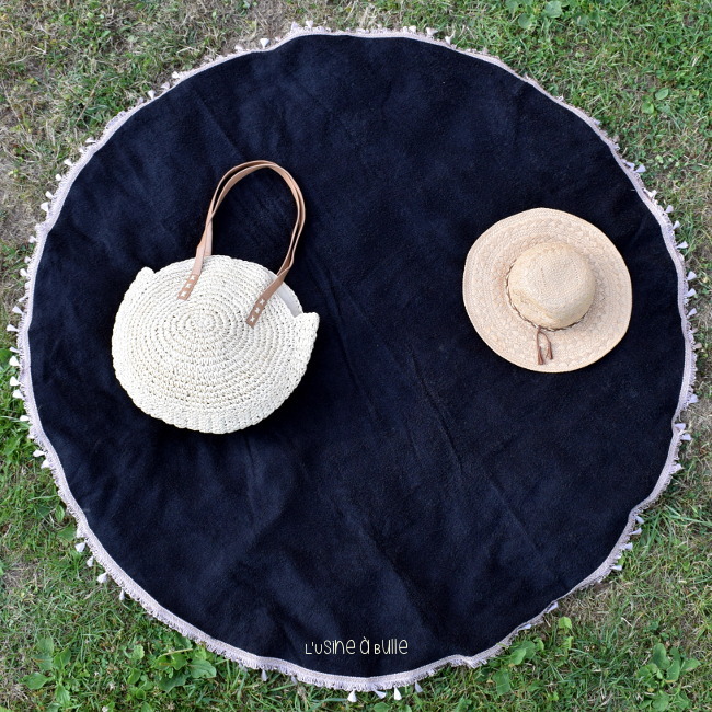 En prévision de mes vacances je me prépare quelques cousettes estivales utiles et rapides. Il me fallait une grande serviette pour faire mes siestes au bord de la piscine. J'ai eu envie de l'assortir à mes accessoires du moment : noir et sable. Je vous la montre aujourd'hui sur ma pelouse (un peu grillée) de Normandie mais bientôt elle ira rejoindre une jolie piscine dans le Sud-Ouest de la France.